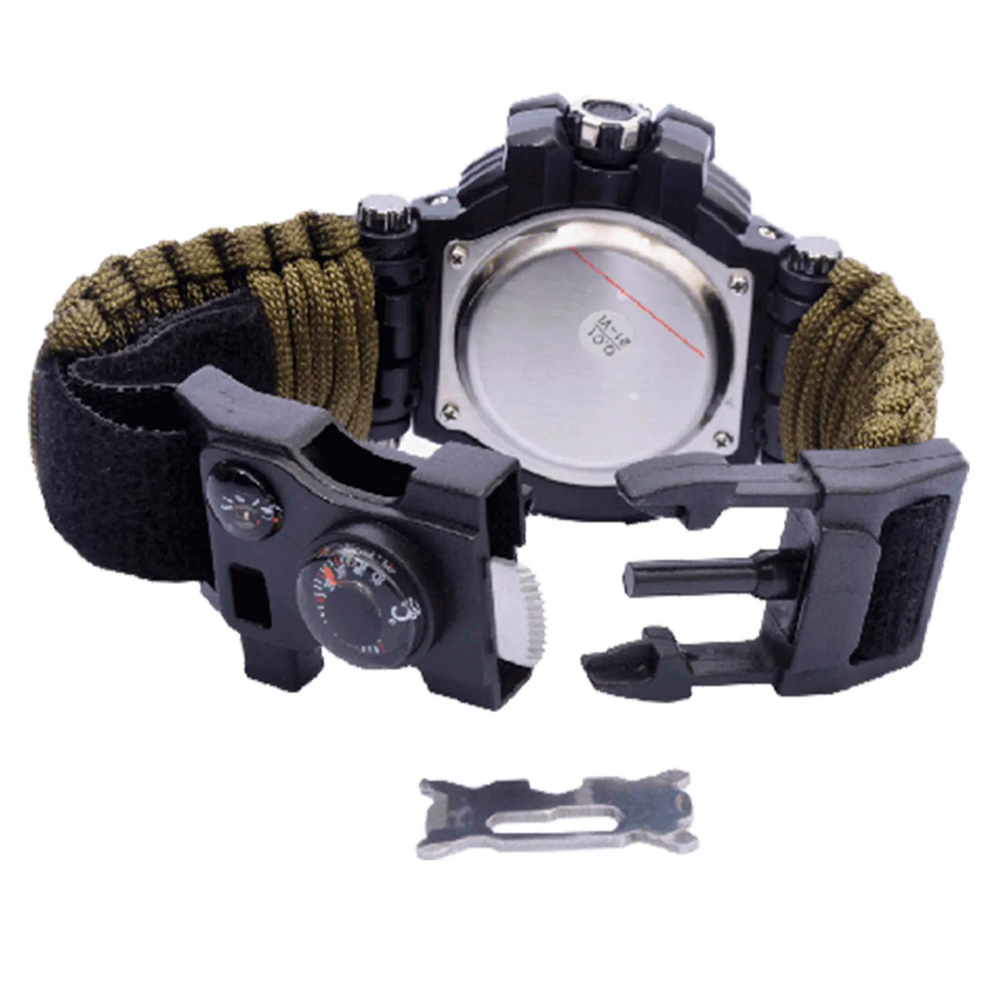 Impermeable, resistente y lleno de herramientas prácticas (Termómetro, silbato, brújula, paracord y más). Perfecto para deporte, camping y uso diario.